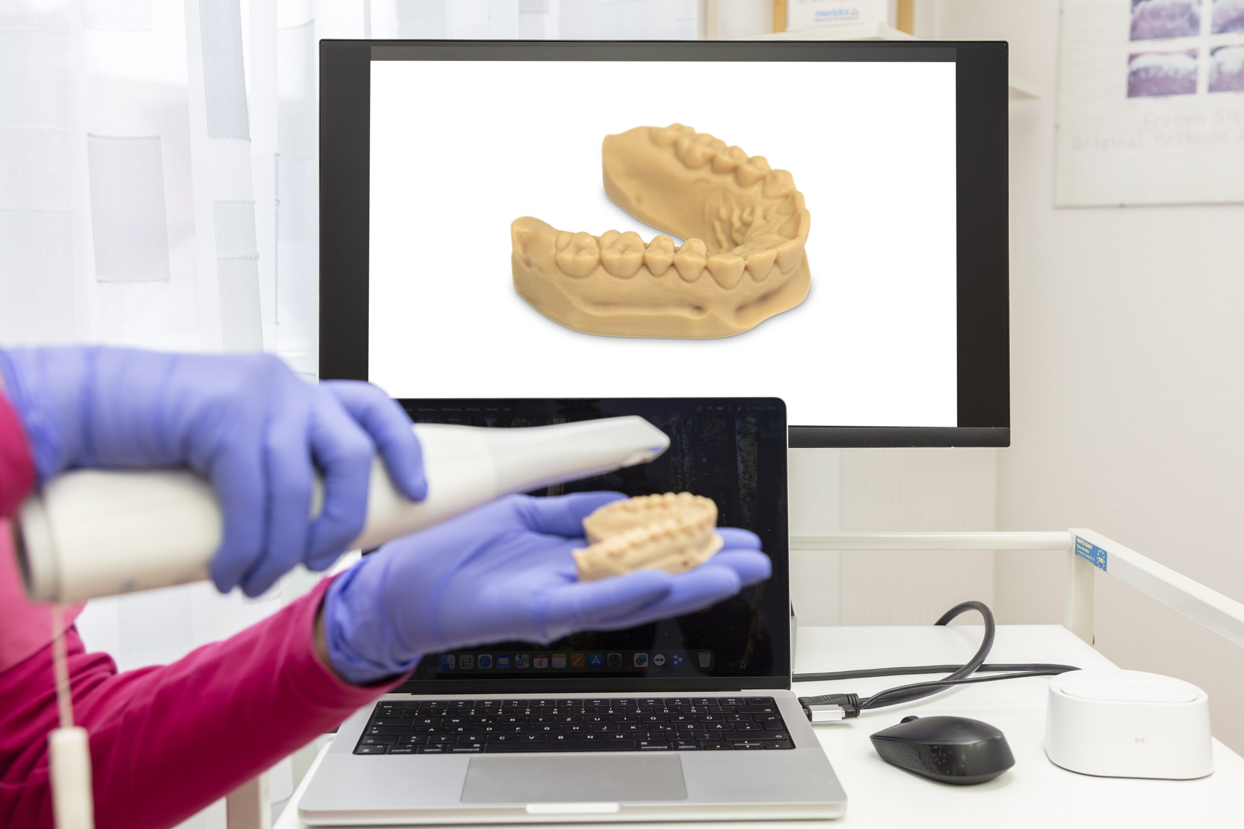 Seit einiger Zeit setzen wir auf die digitale Abformung mit modernen Intraoralscannern. Für unsere Patientinnen und Patienten bedeutet das mehr Komfort, da der Würgereiz entfällt, sowie eine schnellere und deutlich präzisere Erfassung. Das Ergebnis ist sofort als dreidimensionales Modell am Bildschirm sichtbar und kann direkt und ohne Umwege an das Dentallabor übermittelt werden.